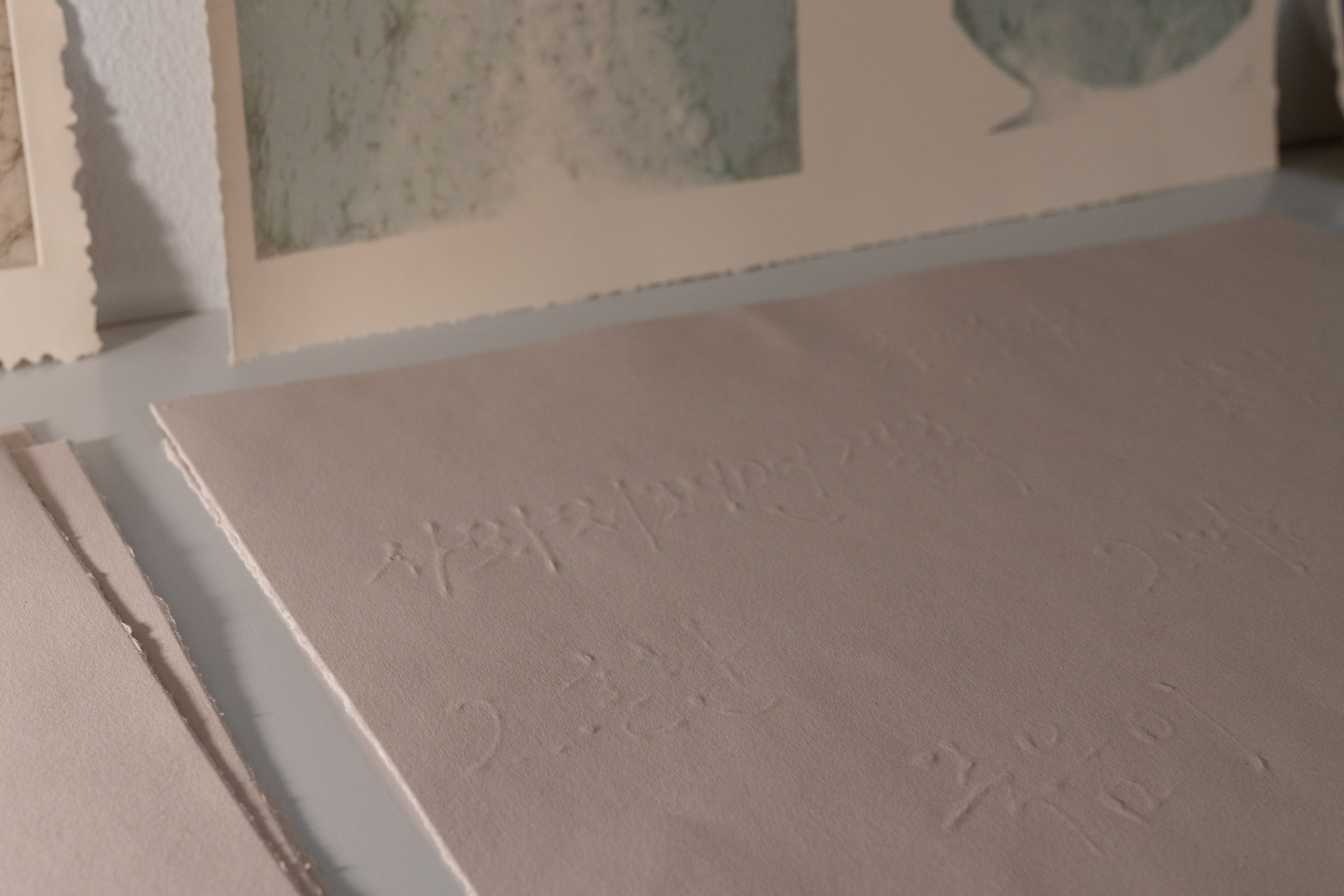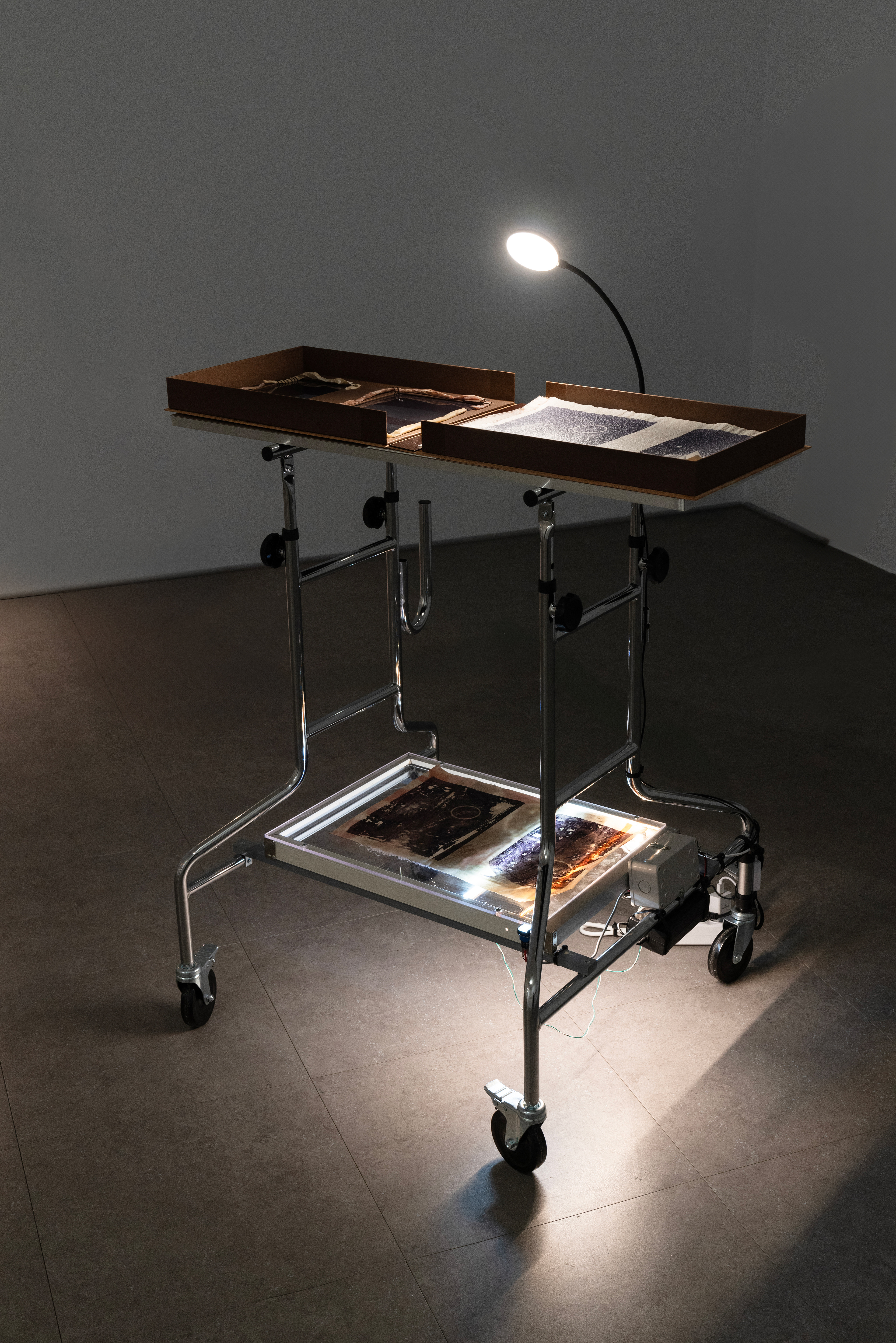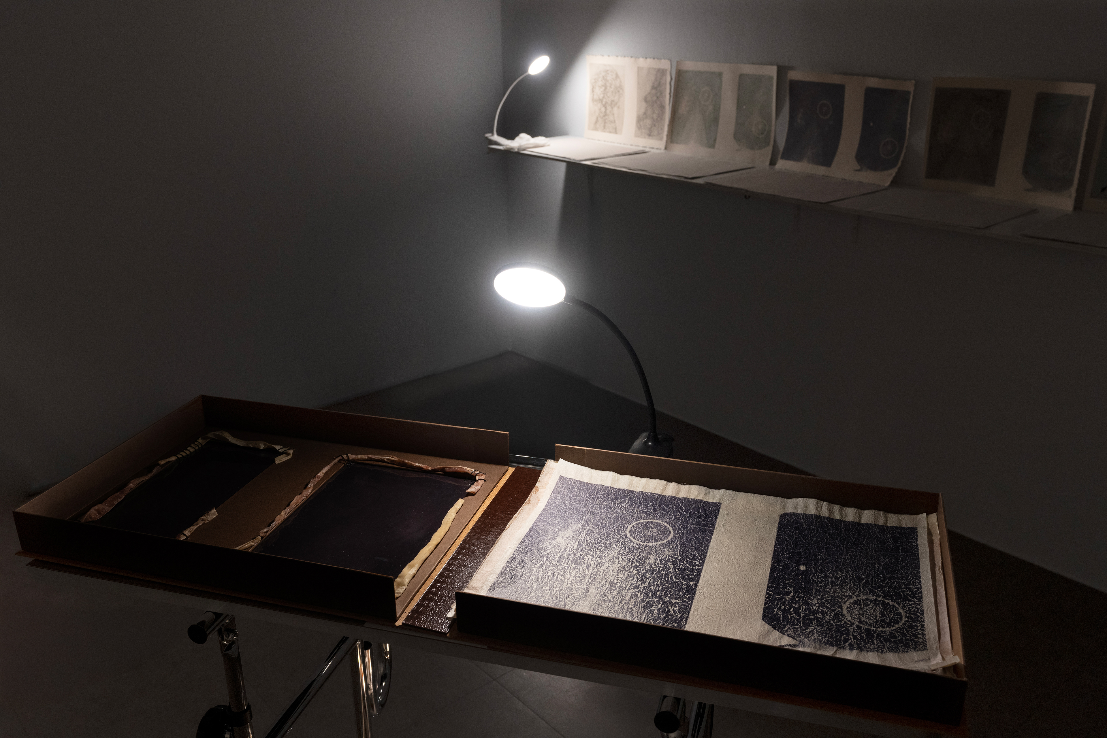 Wandering with a Heart Inside Me, 2025, artist’s book, silkscreen and etching on crumpled paper, natural latex and Rising paper, embossing black on Rising paper, film paper, black cord, stainless steel plate, scanning screen mounted on a medical walker, 33 sheets, variable dimensions