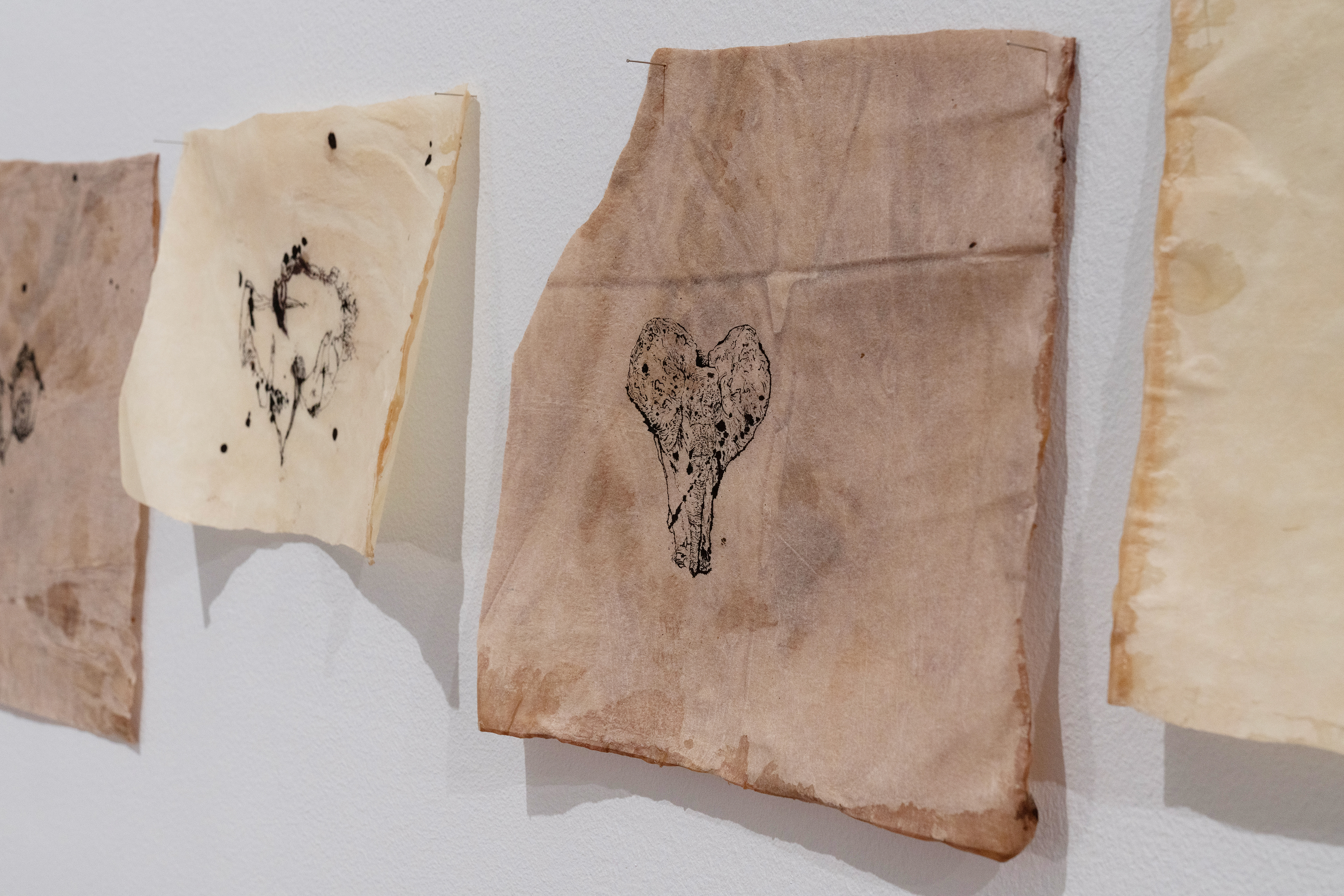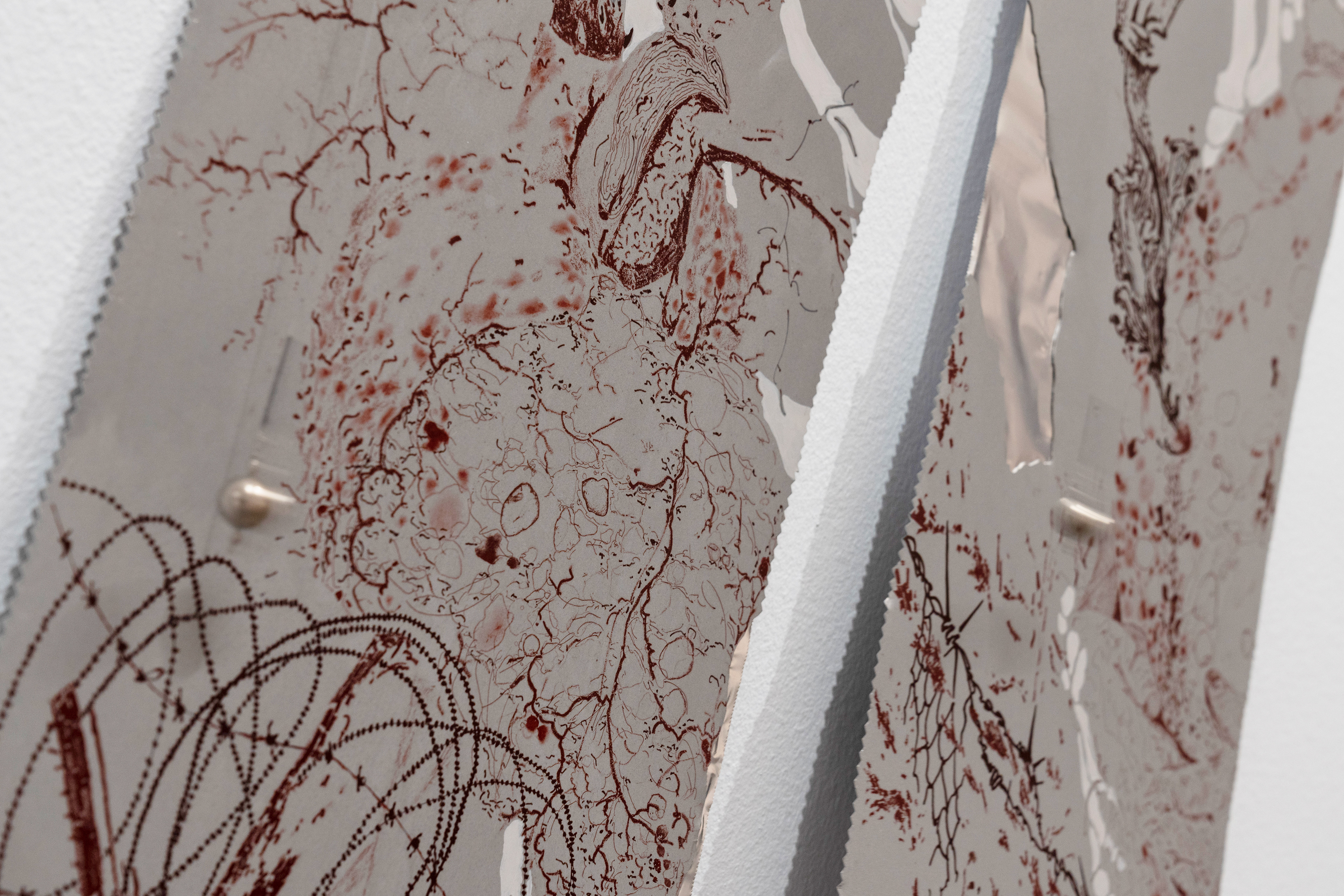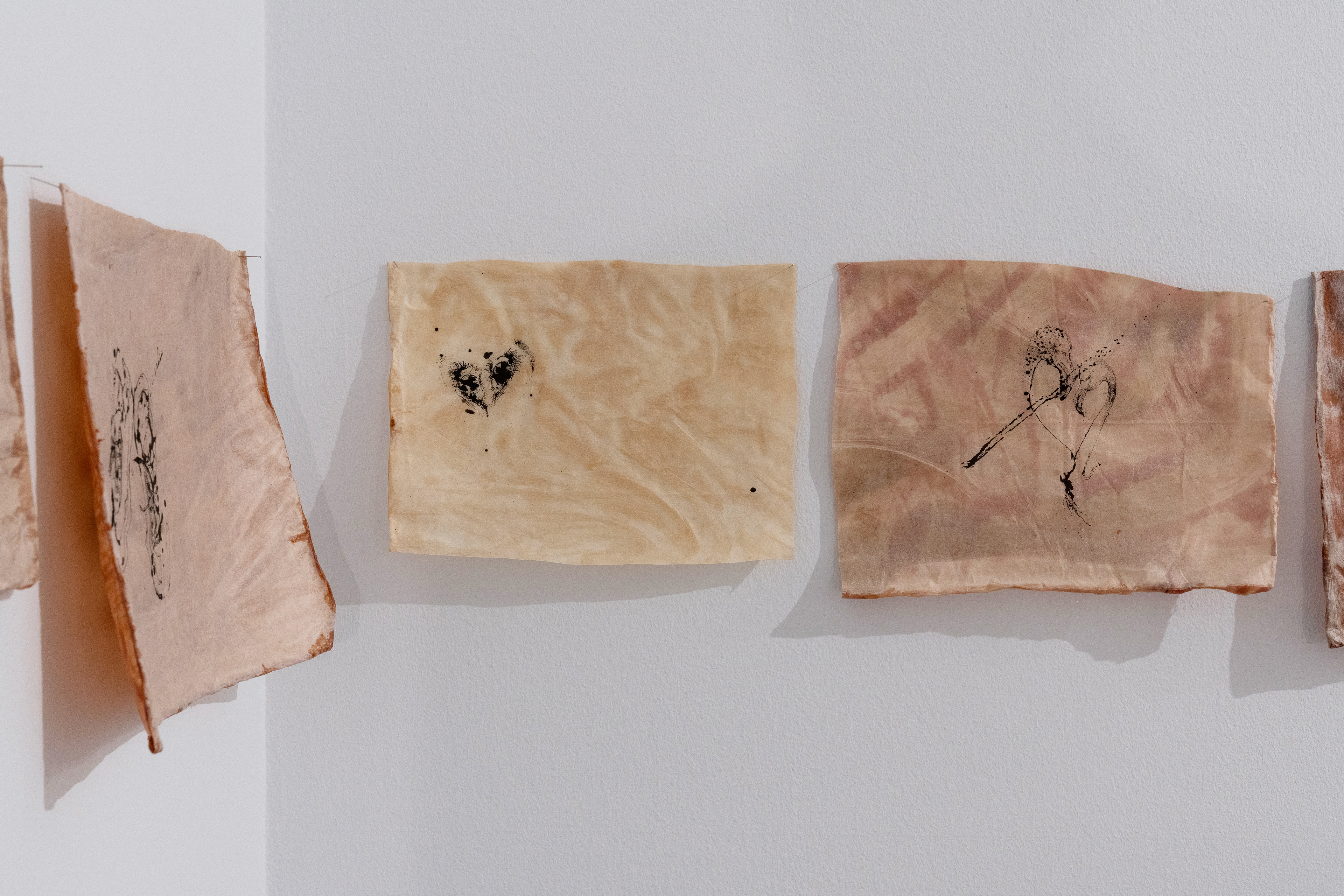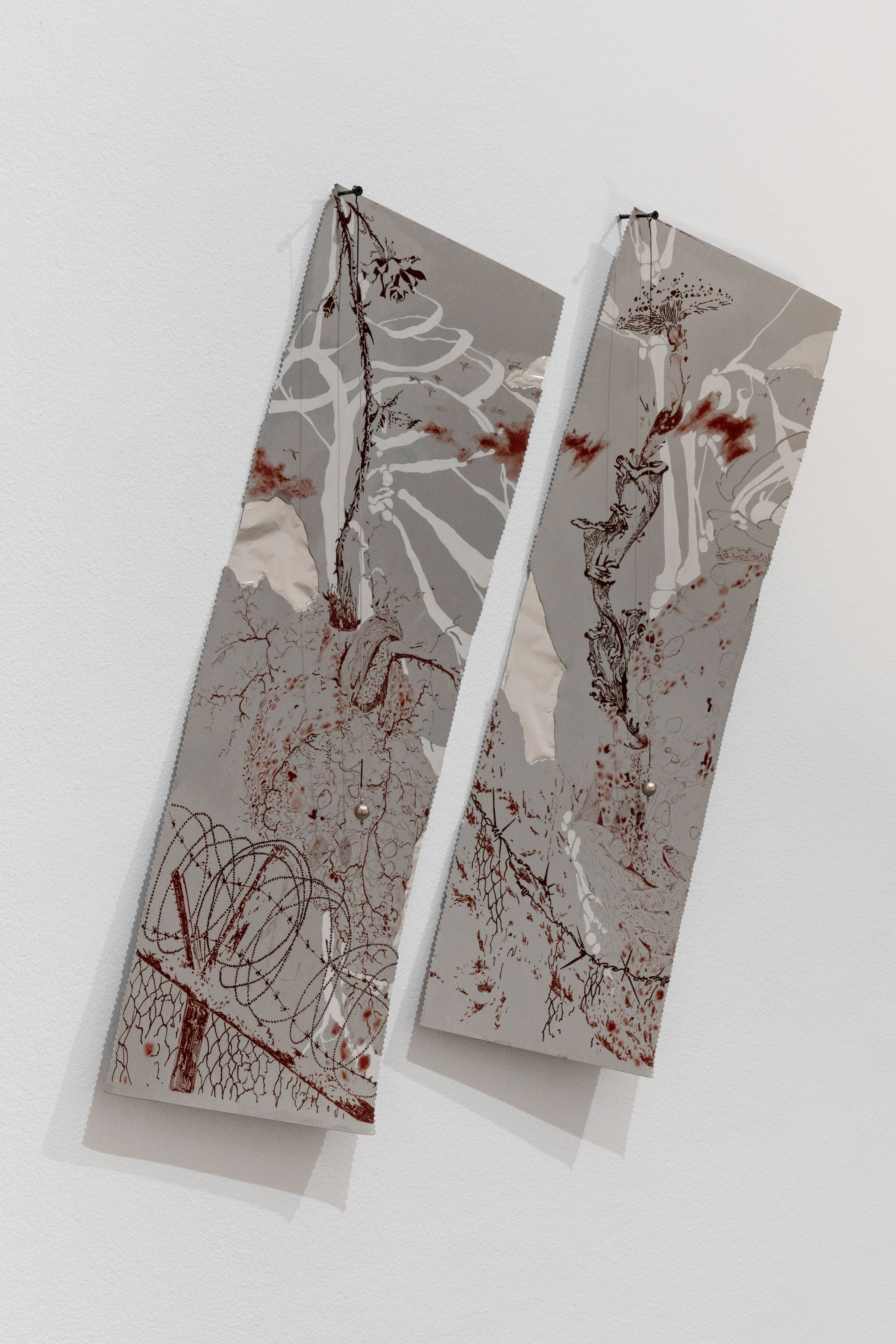 The Day a Heart Was Engraved on My Chest with a Scalpel, 2024, etching and silkscreen on natural latex, thread, fishing hook, two sheets, each 30 ×22 cm
