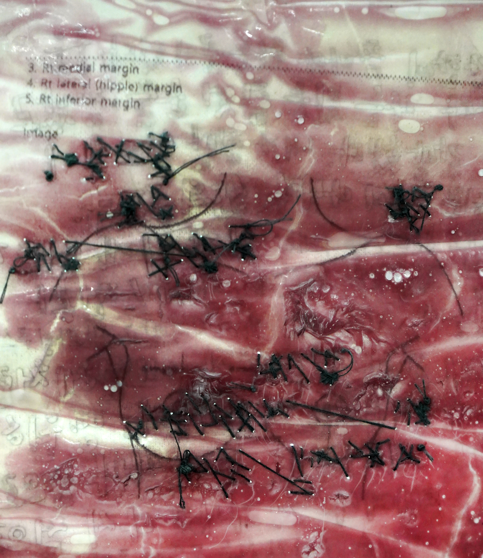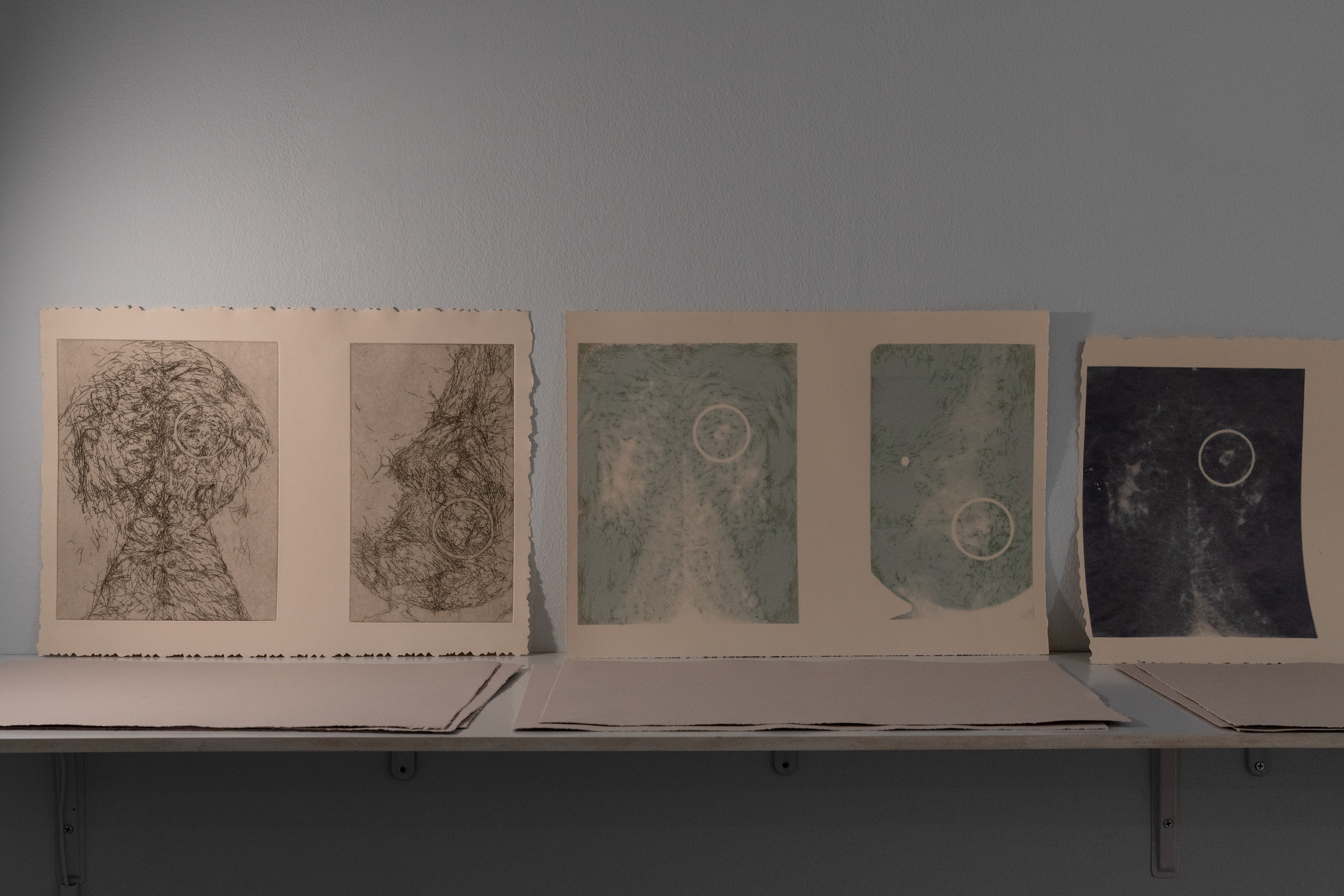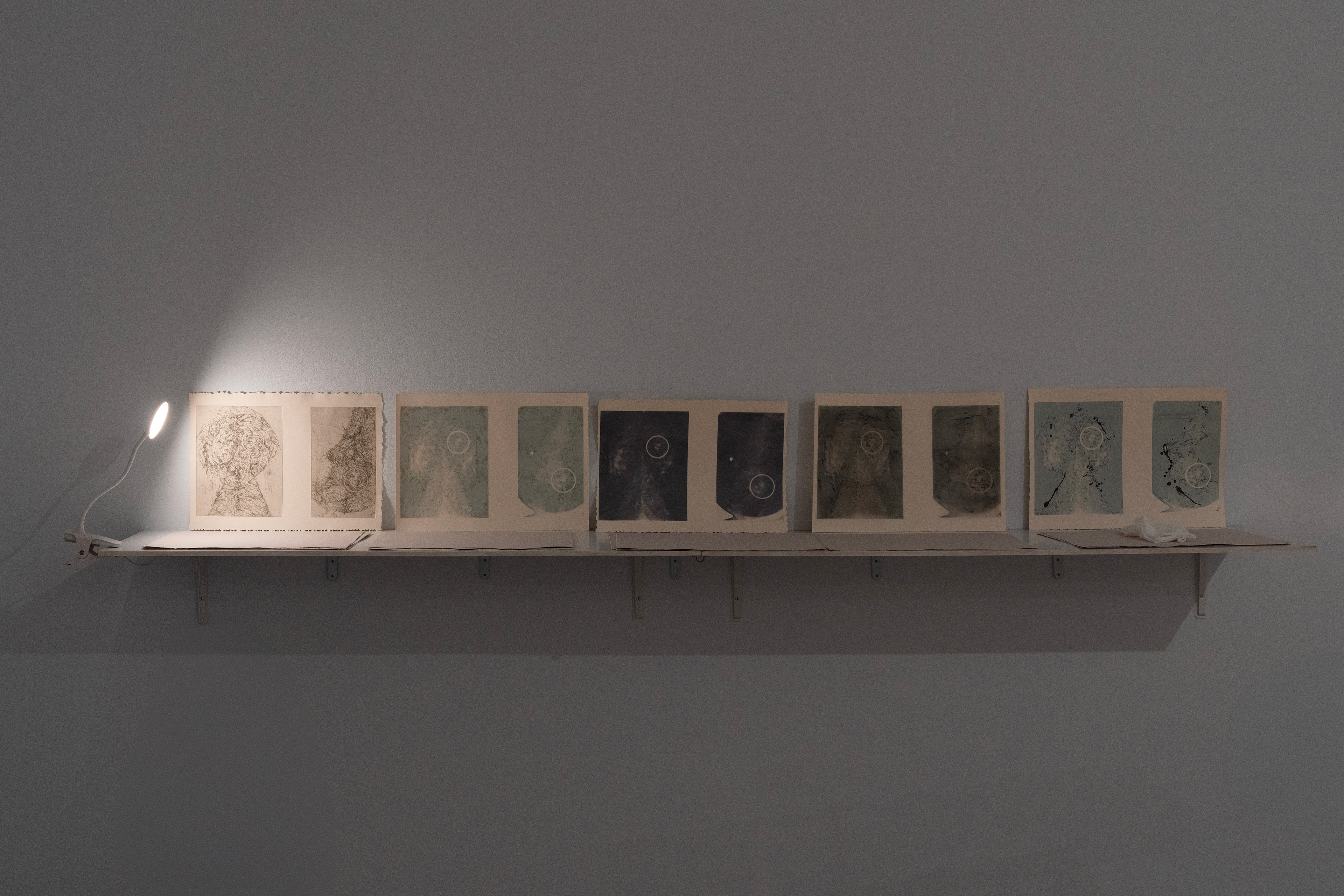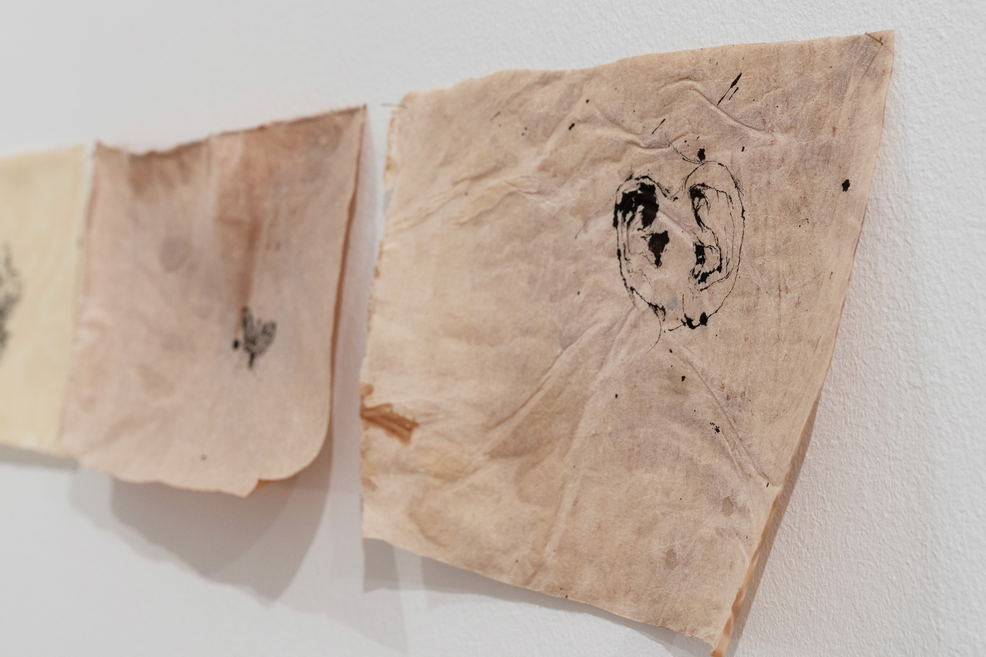 The Day a Heart Was Engraved on My Chest with a Scalpel, 2024, etching and silkscreen on natural latex, thread, fishing hook, two sheets, each 30 ×22 cm