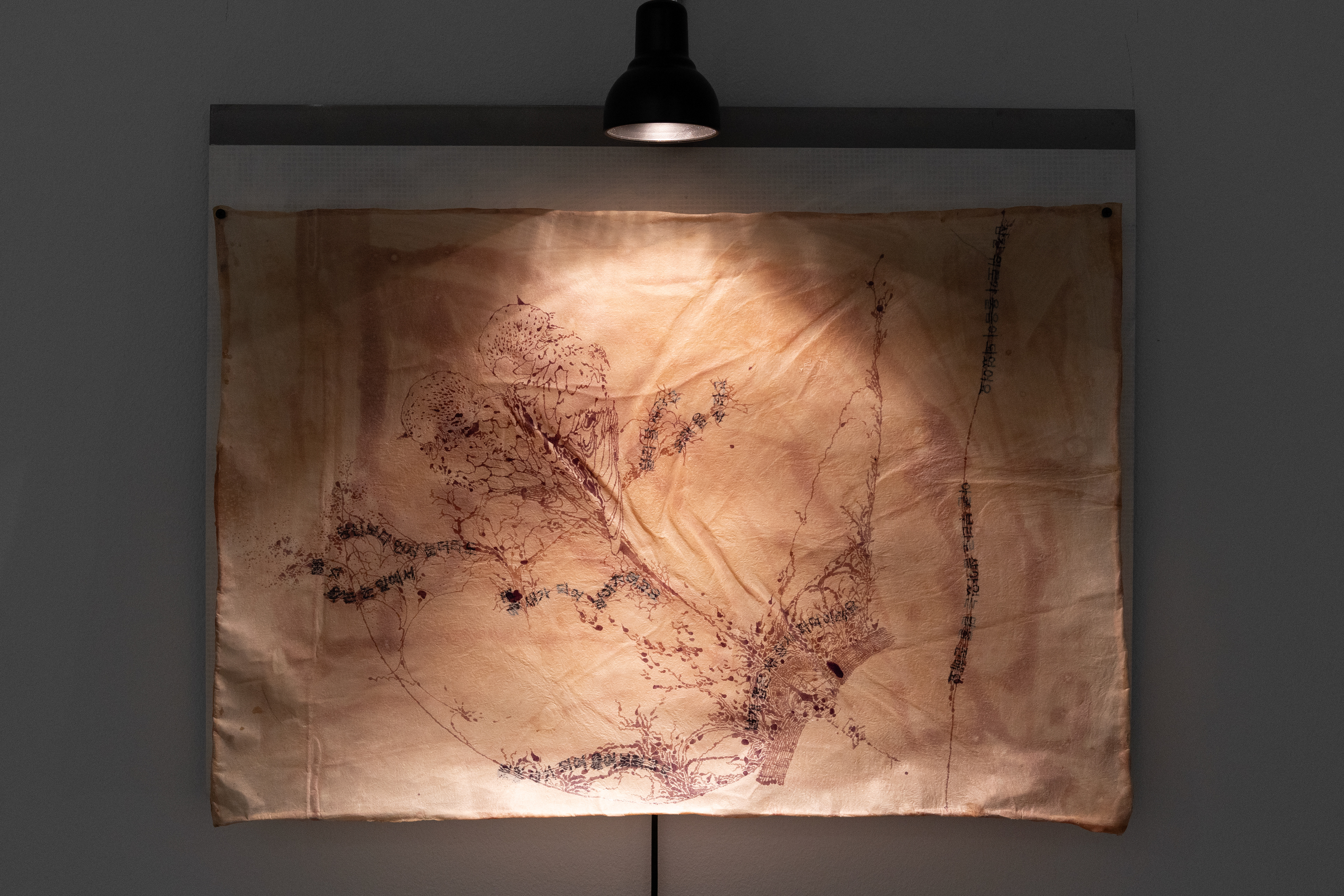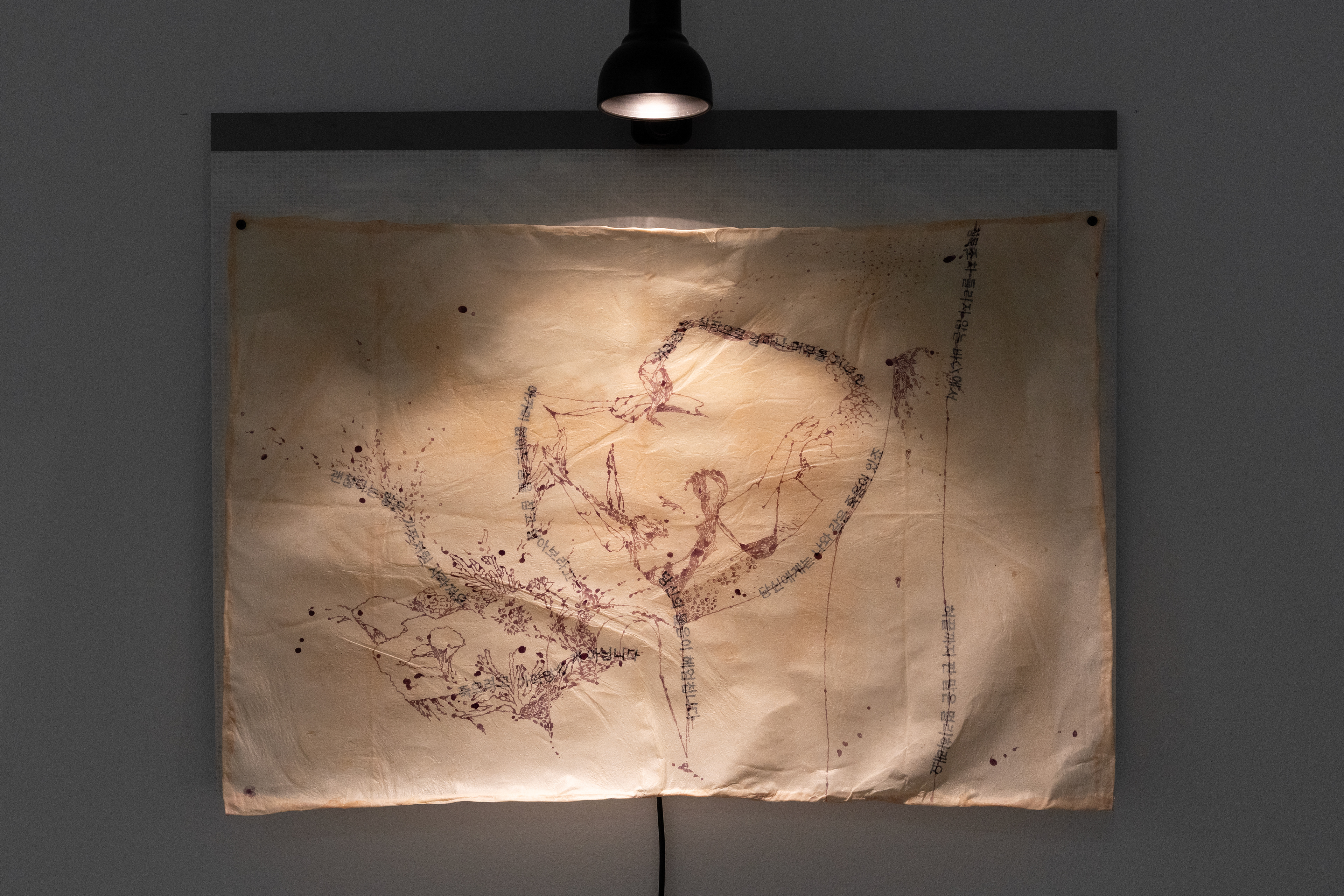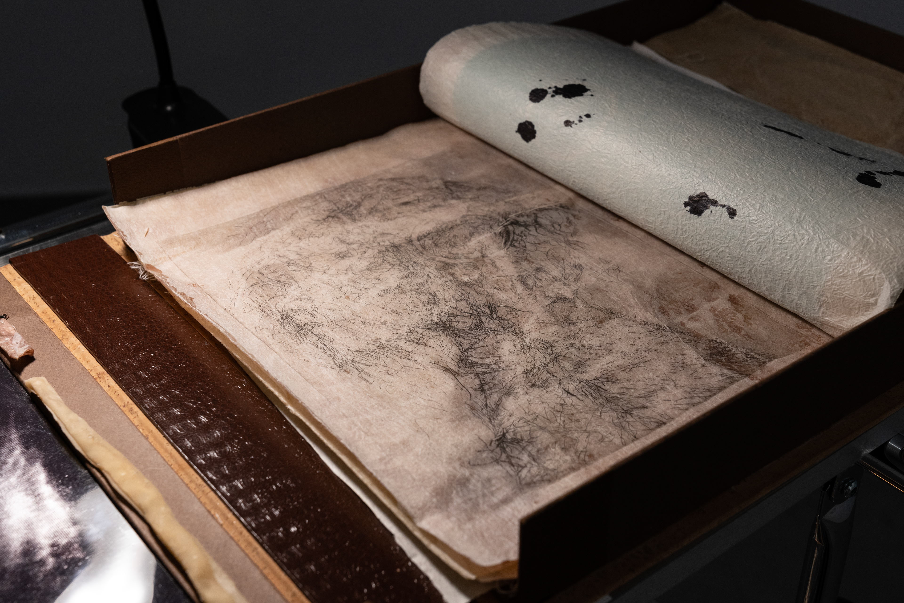 In Search of the Heart, 2024, ink on natural latex, drawn with a hypodermic needle, 17 sheets, variable dimensions