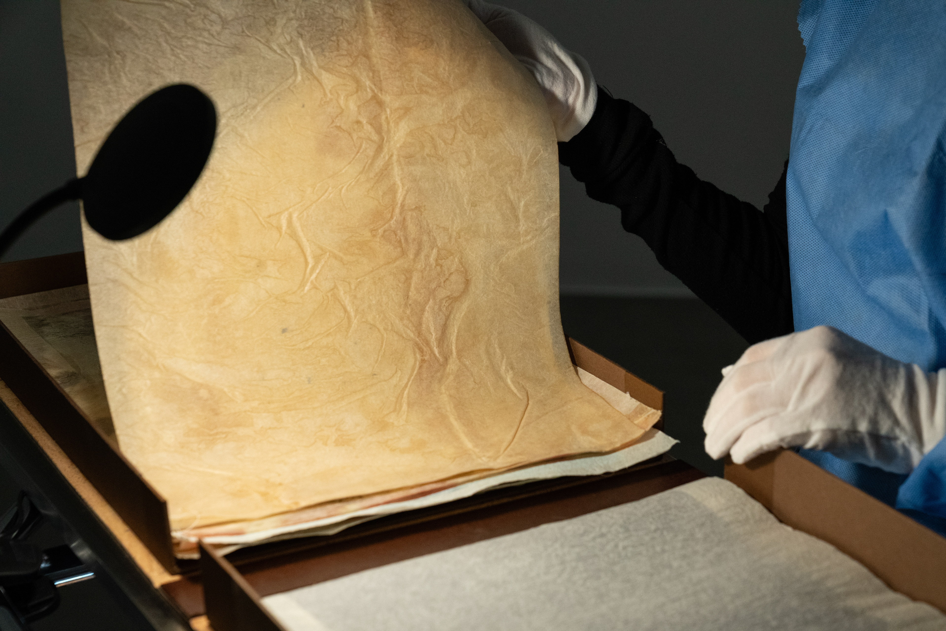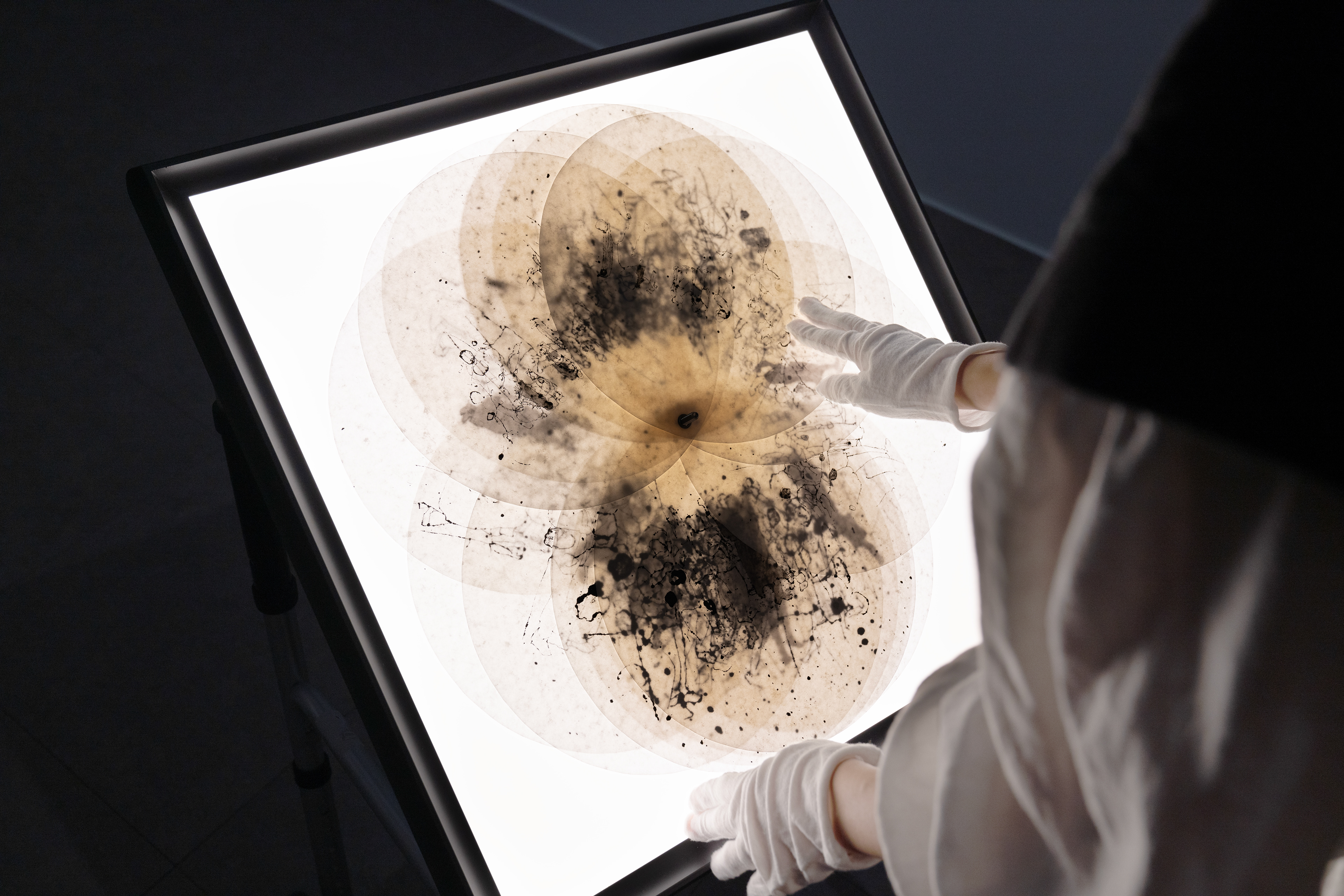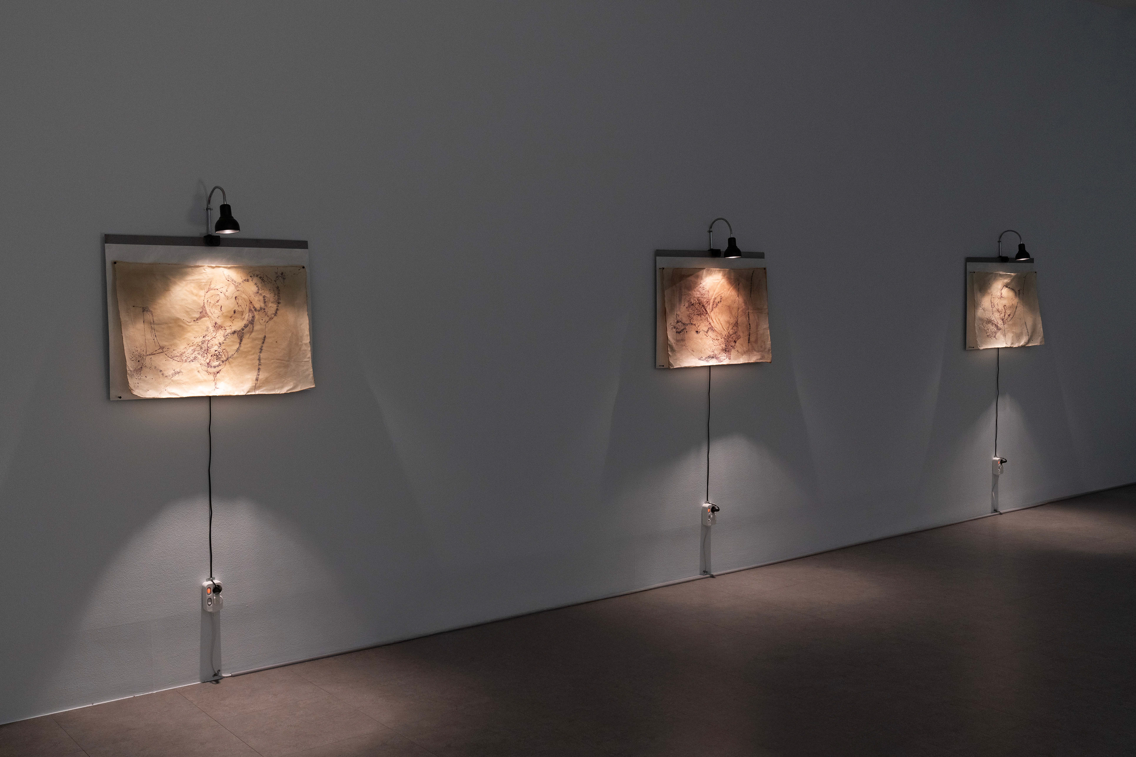 In Search of the Heart, 2024, ink on natural latex, drawn with a hypodermic needle, 17 sheets, variable dimensions
