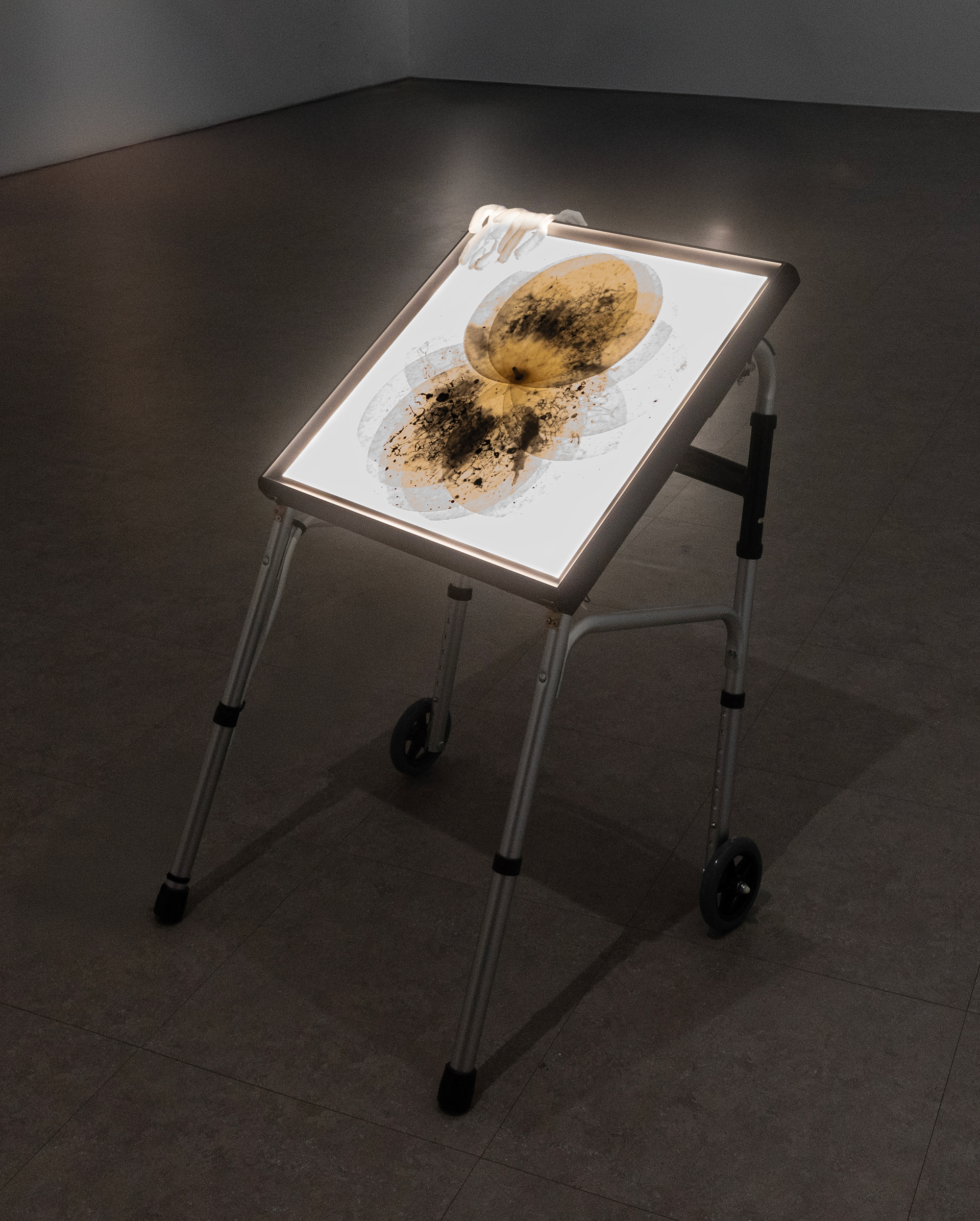 Dance of Pink, 2025, lithograph on paper, lightbox mounted on a medical walker, 16 sheets, variable dimensions
