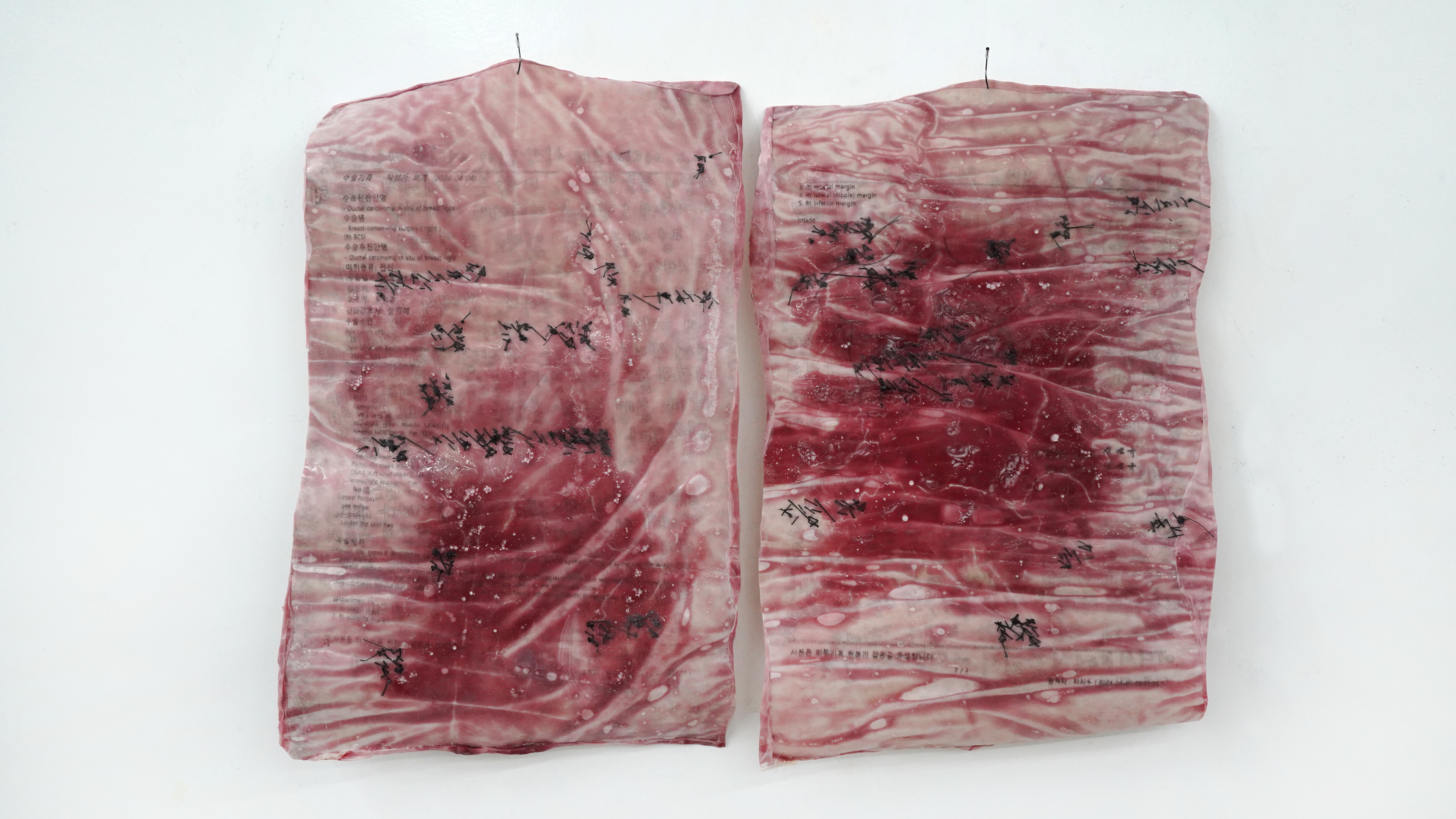 메스로 심장 위에 하트를 새긴 날, 2024, 천연 고무액에 에칭과 실크스크린, 실, 낚시 바늘, 2장, 각 30 x 22 (cm)