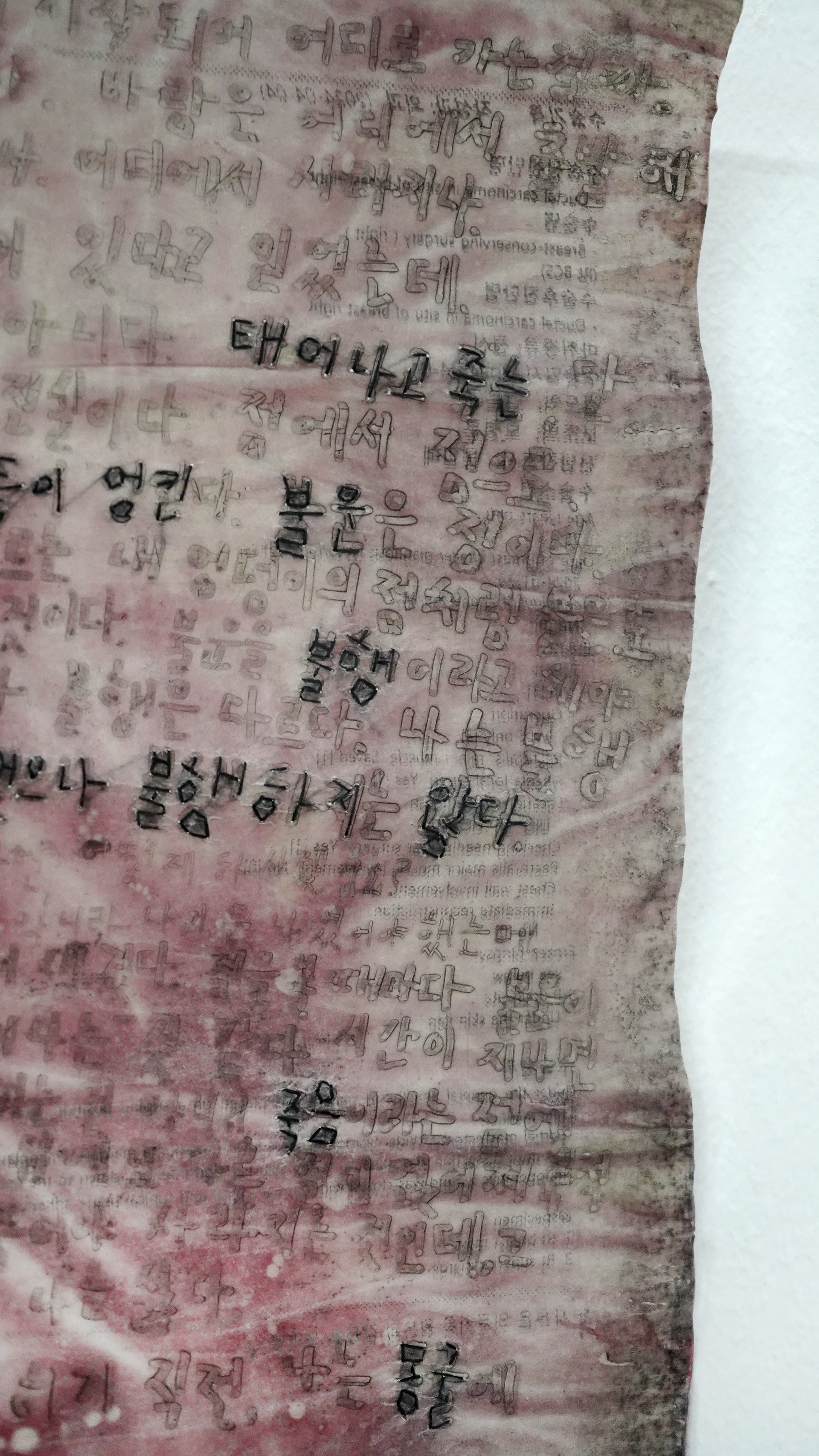 인어와 인어가 만나고, 2024, 천연 고무액에 주삿바늘로 열반응 물감, 실크스크린, 알루미늄 마판, 열전등, 50 x 75 (cm)